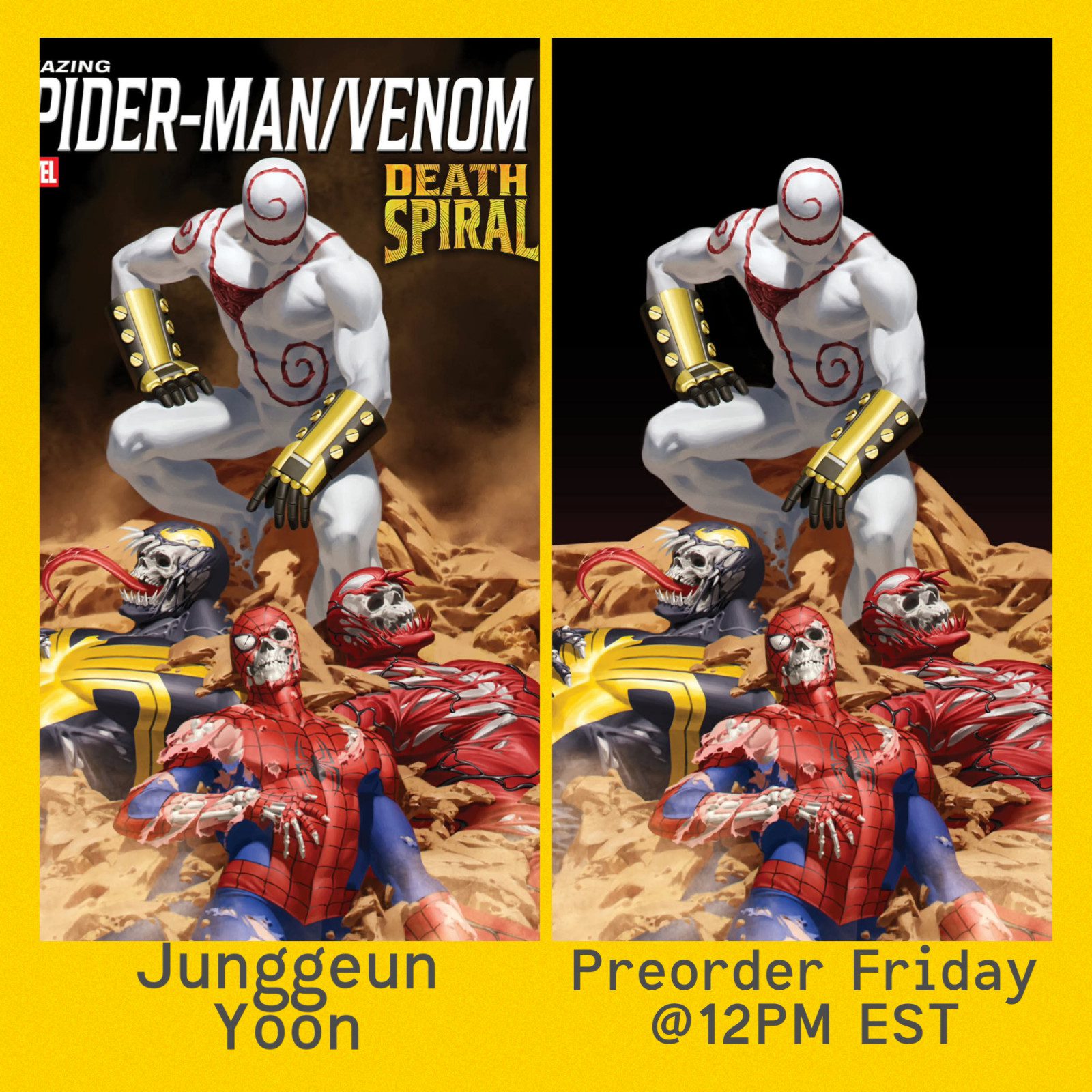 A modern Marvel key capturing the chilling debut of Death Spiral alongside Spider-Man and Venom in a dramatic, cinematic scene by Junggeun Yoon.